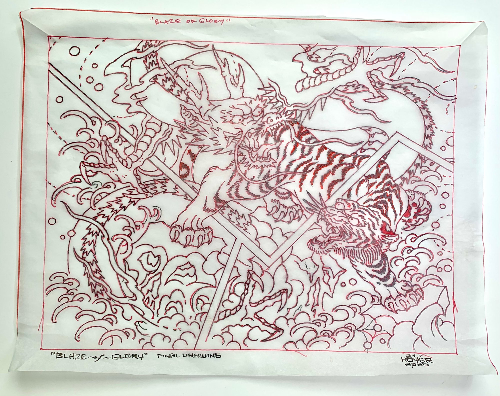 “Blaze of Glory” final drawing, approx. 11” x 14”, marker/graphite on paper, 2025.