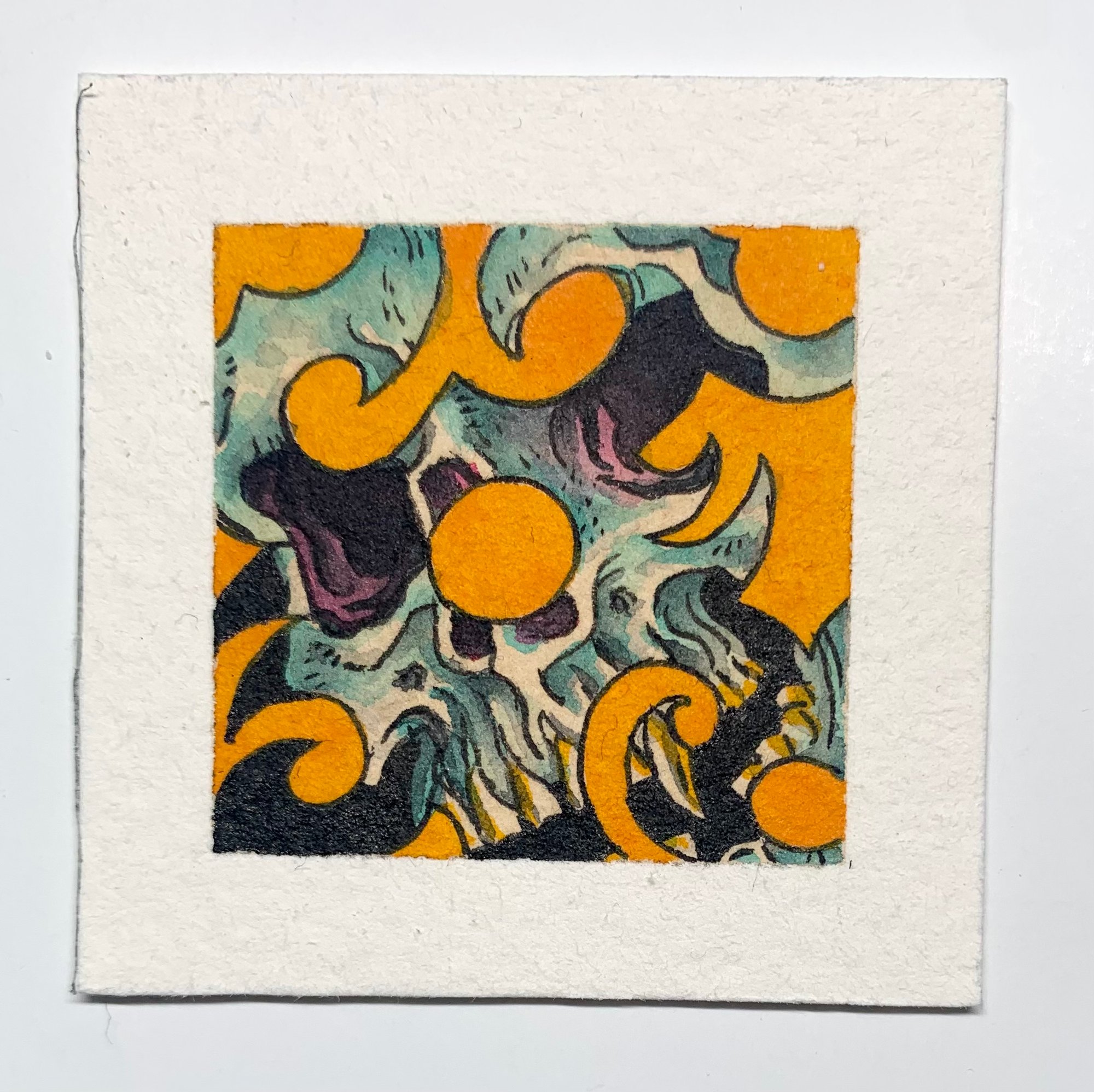 Borneo Skull, approx. 2” x 2”, ink/acrylic/gouache on paper, 2025.