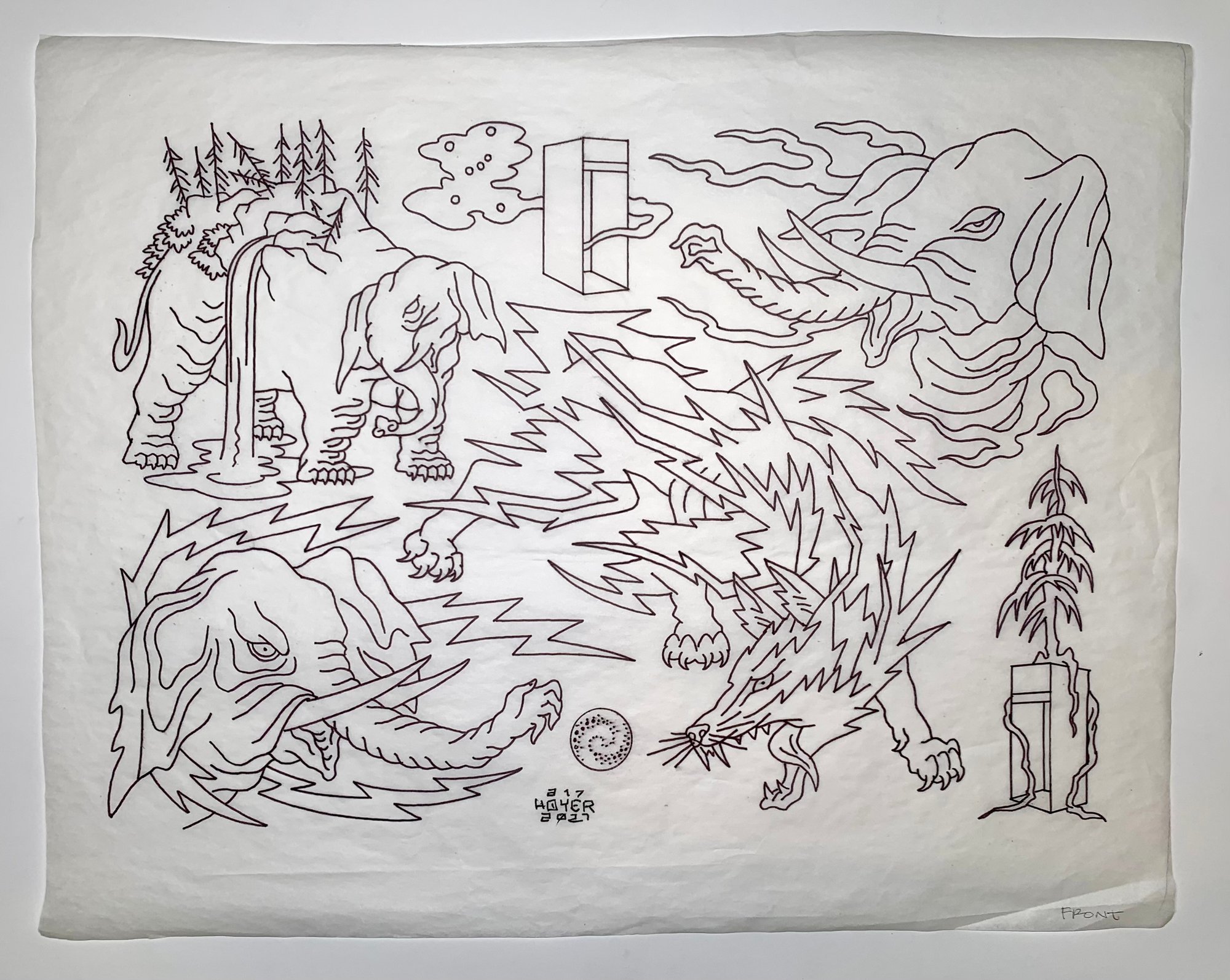 Flash Vol. 1 original line drawing sheet 5, approx. 11” x 14”, ink on paper, 2021.