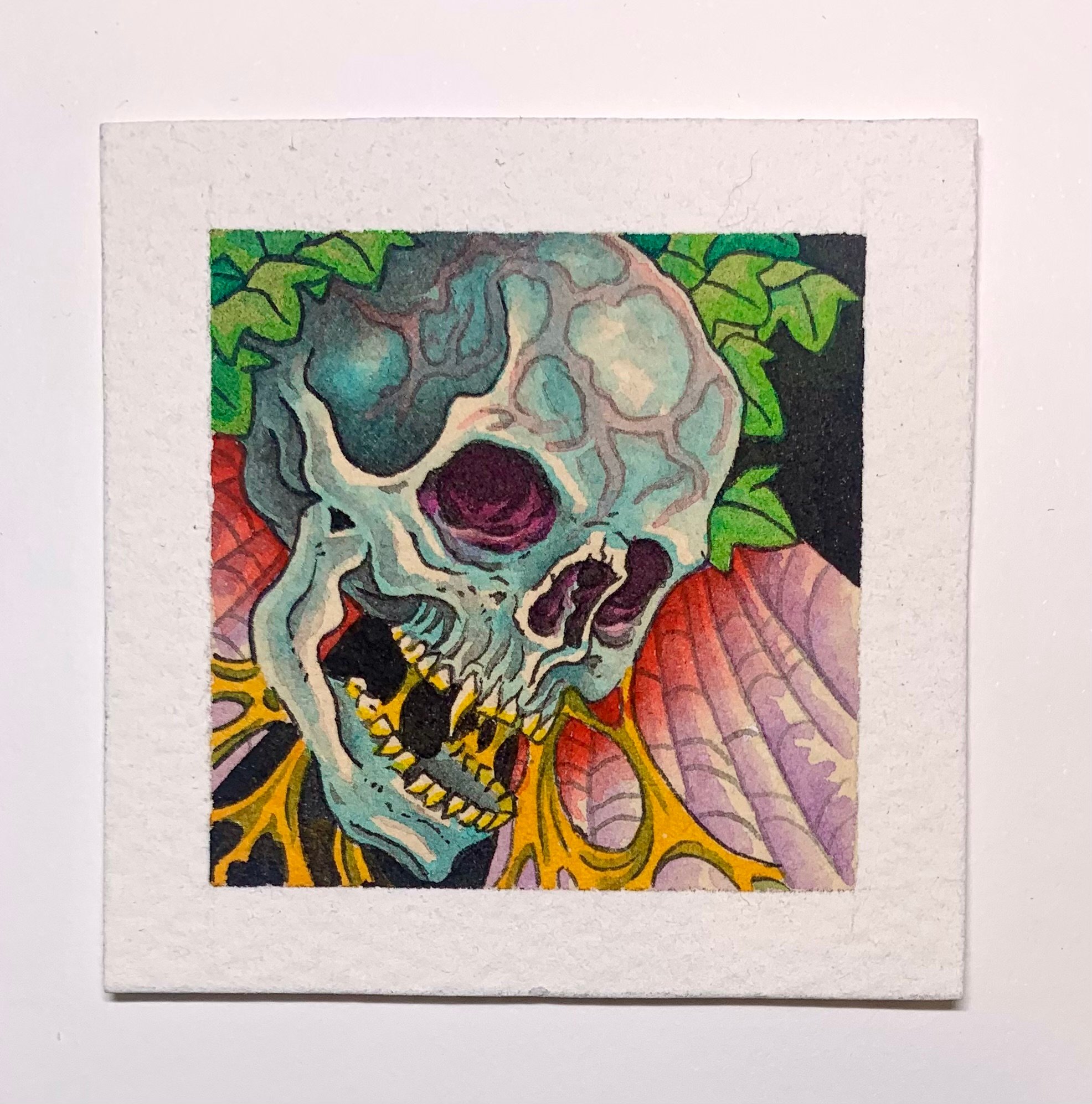 “Ivy Skull”, approx. 2.5” x 2.5”, ink/acrylic/gouache on paper, 2025.