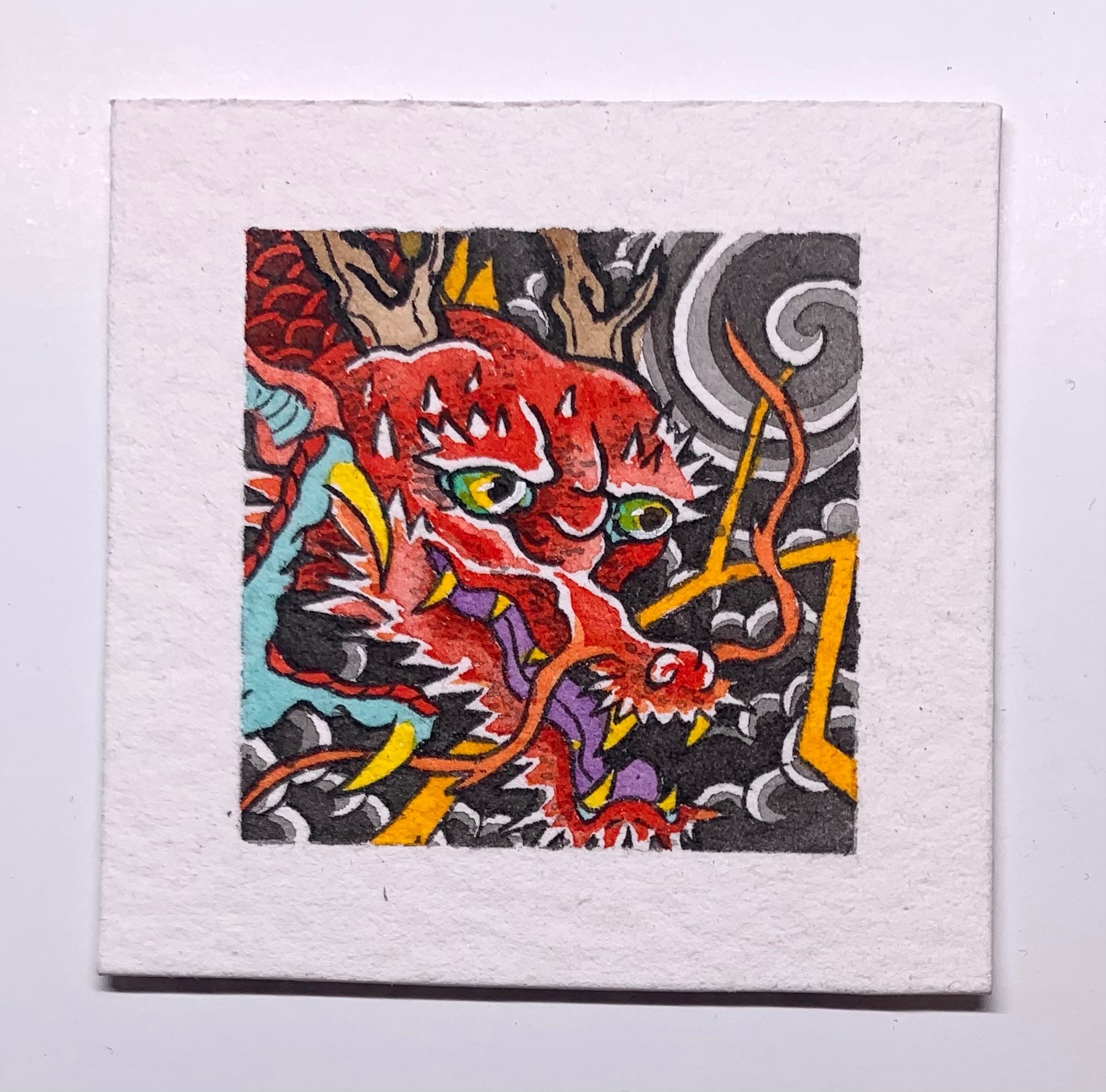 Red Dragon mini painting, approx. 2” x 2”, ink/acrylic/gouache on paper, 2025
