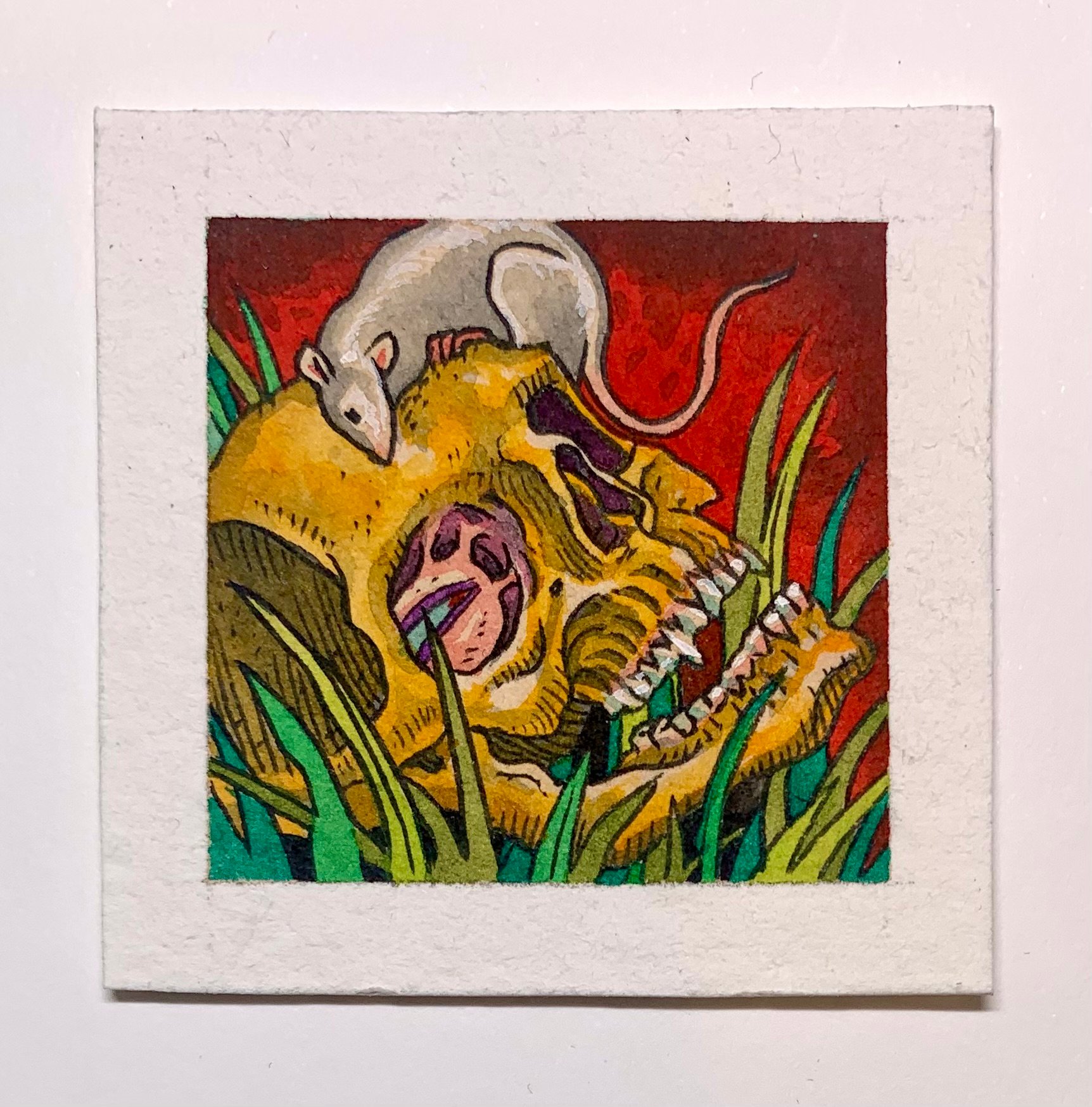 “Skull & Rat”, approx. 2” x 2”, ink/acrylic/gouache on paper, 2025.